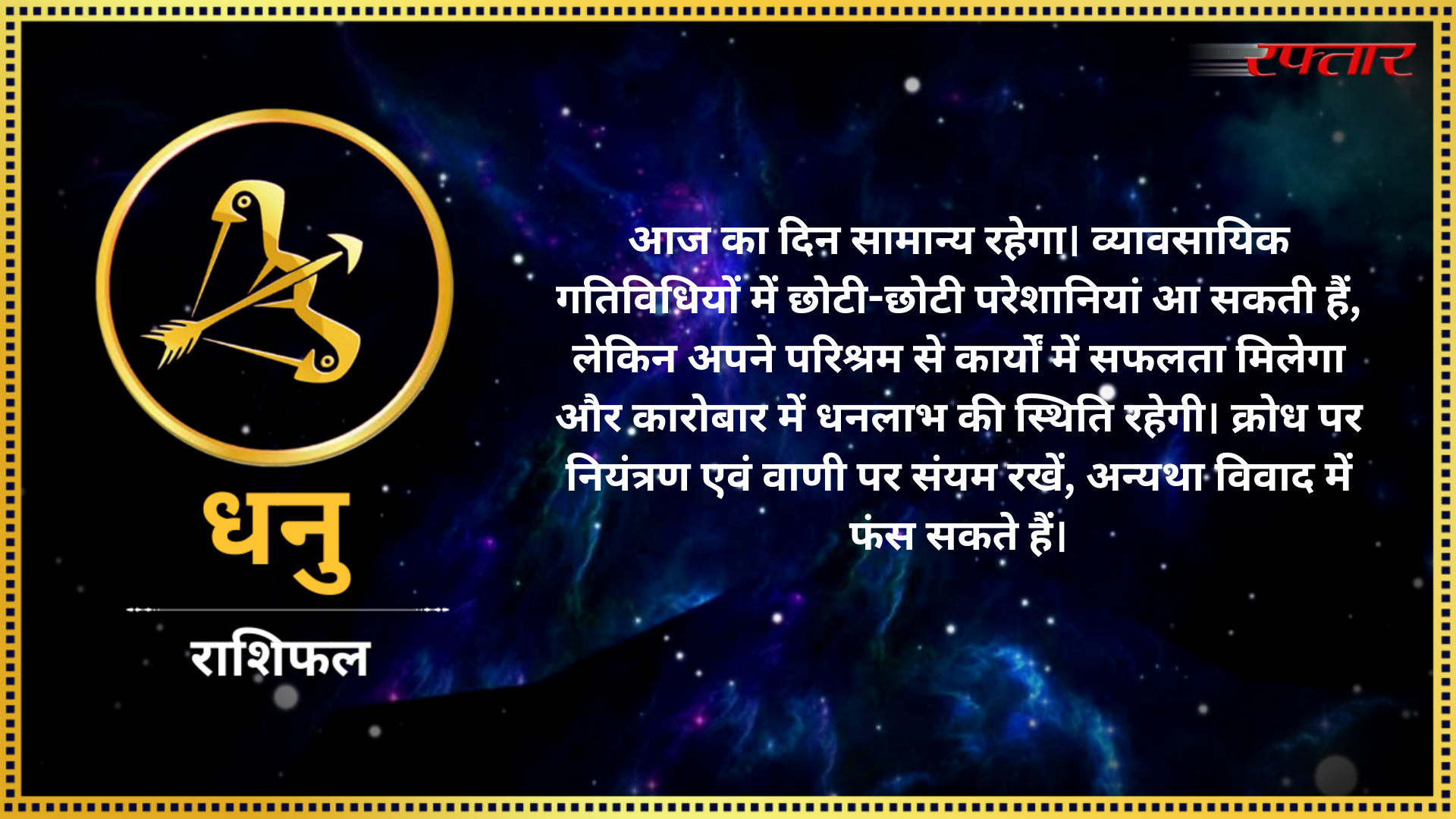 धनु राशि :- आज का दिन सामान्य रहेगा। व्यावसायिक गतिविधियों में छोटी-छोटी परेशानियां आ सकती हैं, लेकिन अपने परिश्रम से कार्यों में सफलता मिलेगा और कारोबार में धनलाभ की स्थिति रहेगी। क्रोध पर नियंत्रण एवं वाणी पर संयम रखें, अन्यथा विवाद में फंस सकते हैं। अनावश्यक धन व्यय की संभावा रहेगी। परिवार का माहौल अच्छा रहेगा, लेकिन ध्यान रखें कि किसी को आपकी बातों से ठेस न पहुंचे। स्वास्थ्य का ध्यान रखें और वाहन सावधानी पूर्वक चलाएं।