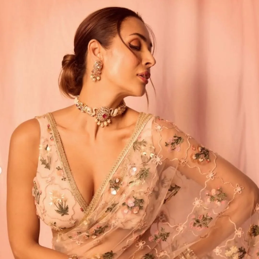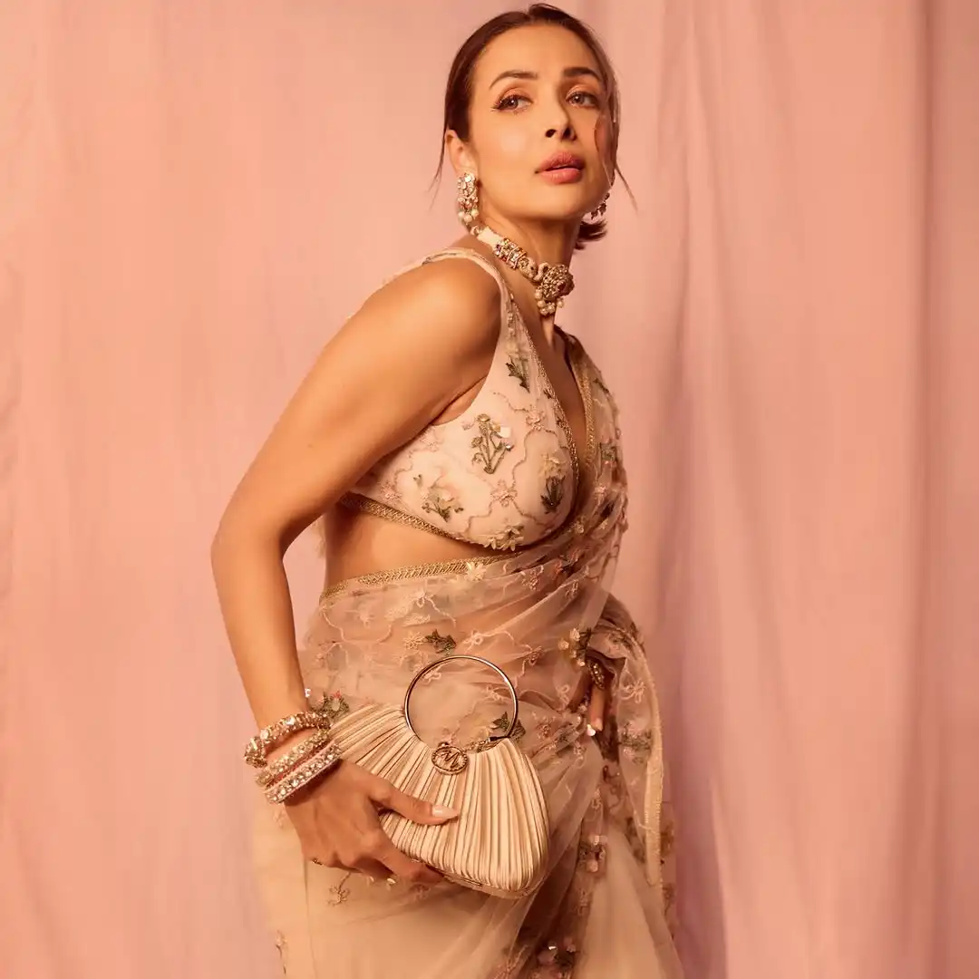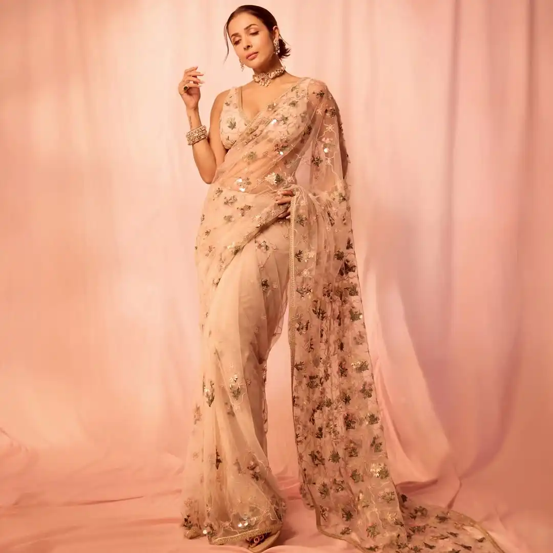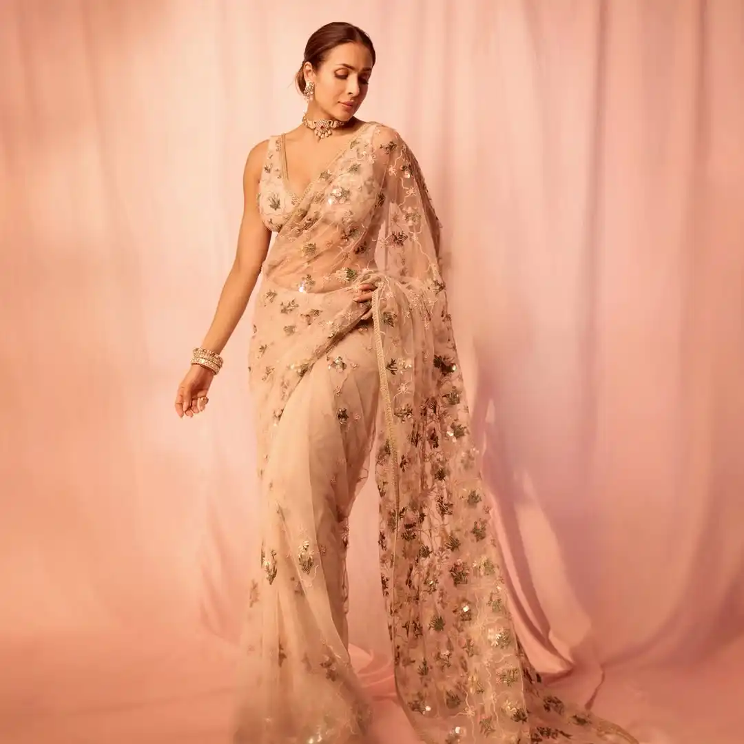 तस्वीरों में सीक्विन्ड साड़ी पहने नजर आ रही हैं। जो काफी अच्छी डिजाइन की गई हैं। इन में मलाइका का मदहोश कर देने वाला अंदाज देखने लायक है।